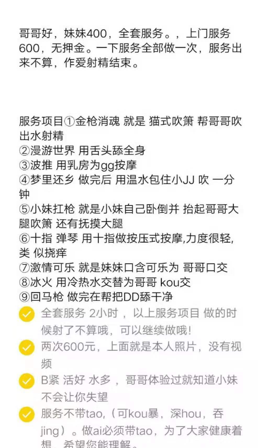 凡是有要求路费/定金/保证金/照片验证/视频验证等任何提前付费的行为,千万不要上当。同时也请注意仙人跳,在寻欢前不要露富和带过于贵重随身物品。本站为分享信息并不对寻欢经历负责,碰到有问题的信息,请及时举报给我们删除信息。