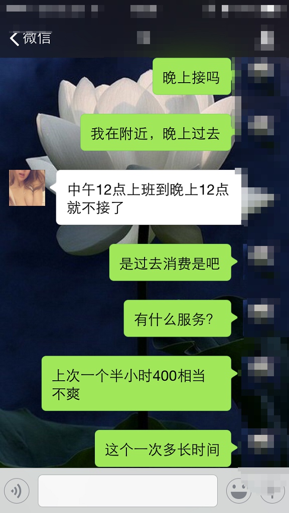 PS:我这一开始是找的中介的信息,见到小姐要的400,她说以后直接找她200,你们也可以去找中介,上面的项目纯属坑爹的,一会我把图发上去,也就是看看玩吧,实际上只有打炮和口交,因为那个妹子年龄不大,不会别的活,但是主要是妹子年龄小,给她照像死活不让,不过样貌倒是不错可以打85分以上,还是建议大家去。